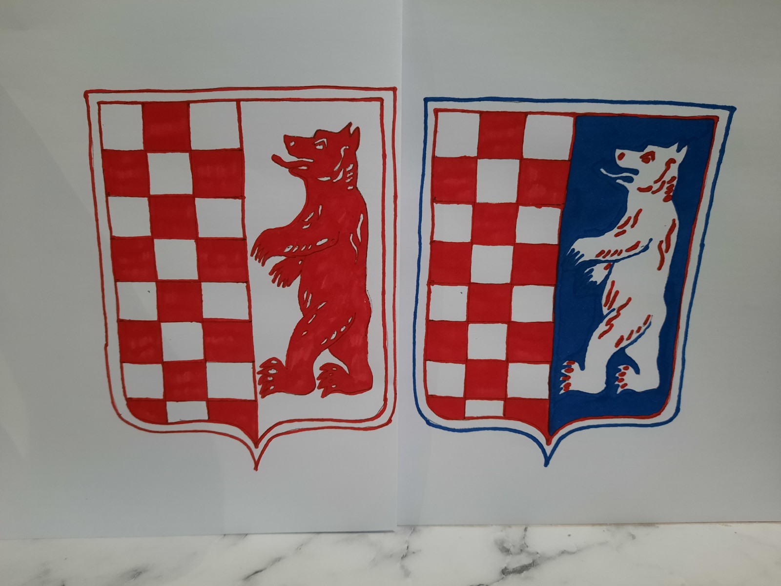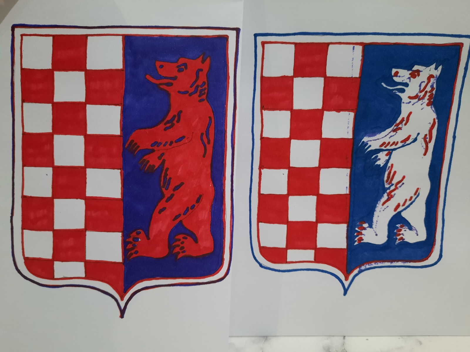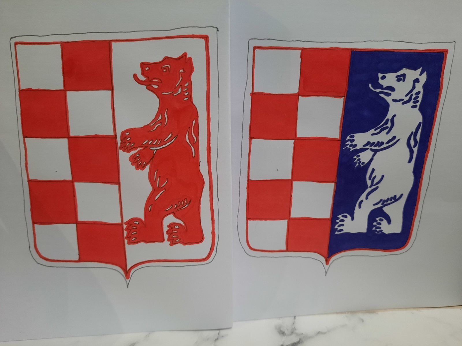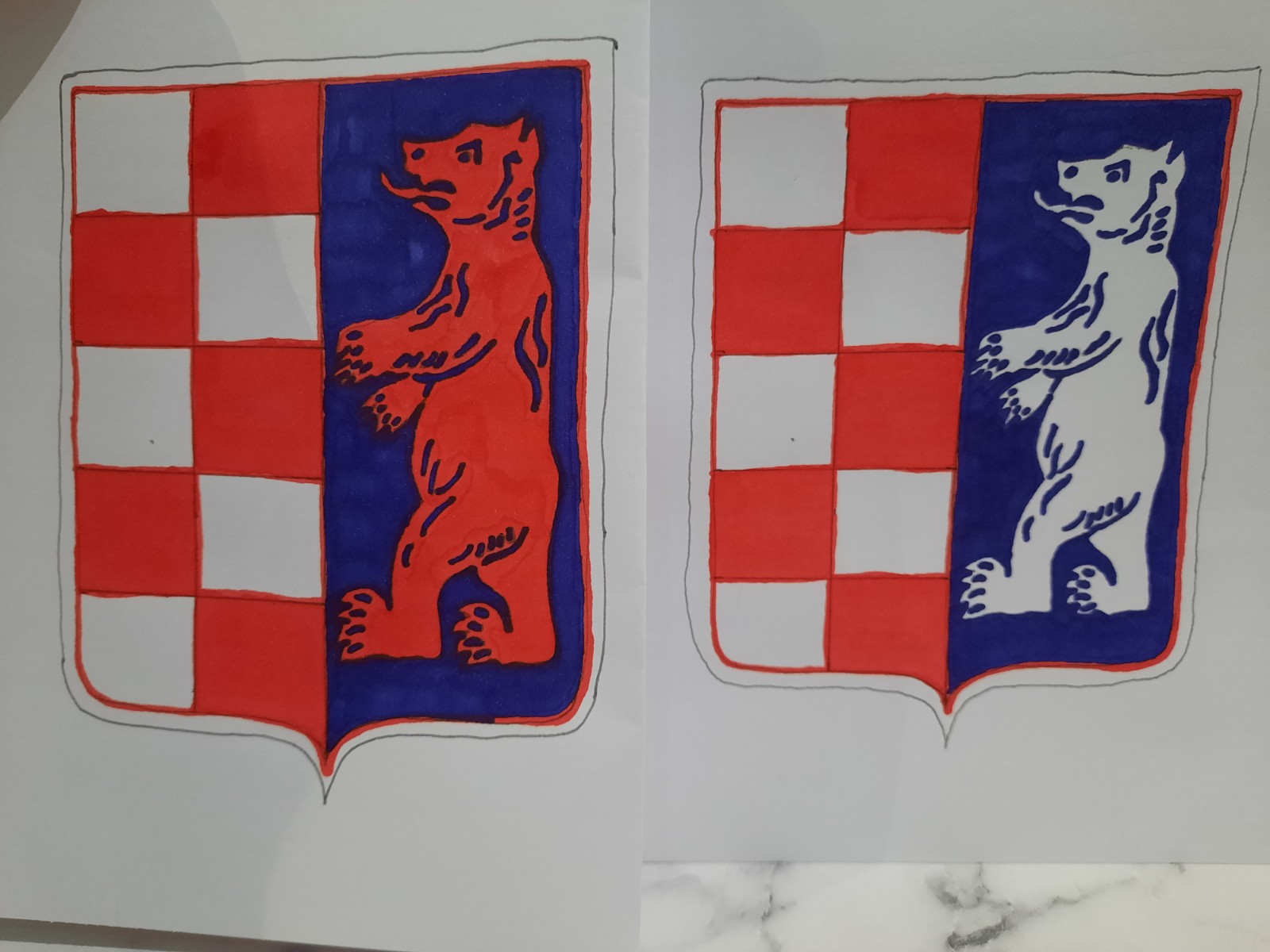 Wahałem się mocno przy wyborze tła po prawej stronie, za Niedźwiedziem. Białe czy niebieskie (białe też miałoby sens: Czerwona Ruś na byłej, Białej Chorwacji np… – stanęło przy niebieskim, gdyż brakowałoby tego koloru Nawii w herbie wg mnie, a poza tym…z niebieskim bardziej podobało się mojej córce 🙂 ) i/lub podmiankę szachownicy na 8 biało-czerwonych pasów (również symbolizujących zarówno przemieszanie/powiązanie/więź Jawii z Nawią, teraźniejszości z przeszłością, pamięć, krew, honor itd. w liczbie symbolizującej nieskończoność (8 pasków) i nawiązującą do wielu innych rzeczy, od zodiaku począwszy (po 12 białych i 12 czerwonych kwadratów)…
