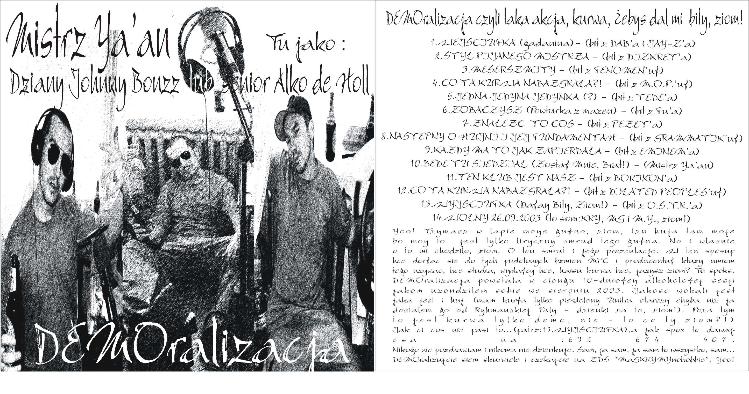 2003 – DEMORALIZACJA Album: DEMORALIZACJA Rok: 2003 Nagrano w: LUBIN Label: RYMOBITTOFABRYKA Odsłuch: YOUTUBE Download: RBTOF/ CHOMIKUJ Udostępnij: Kliknij, aby udostępnić na X (Otwiera się w nowym oknie) X Kliknij, aby udostępnić na Facebooku (Otwiera się w nowym oknie) Facebook Lubię Wczytywanie…
