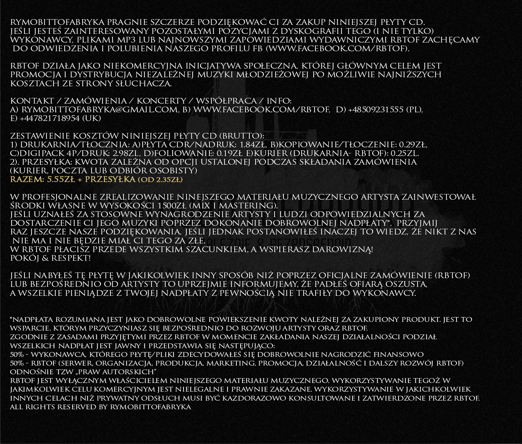 Aby dokonać zamówienia lub pobrać płyty w darmowej wersji mp3 skontaktuj się z Rymobittofabryką: